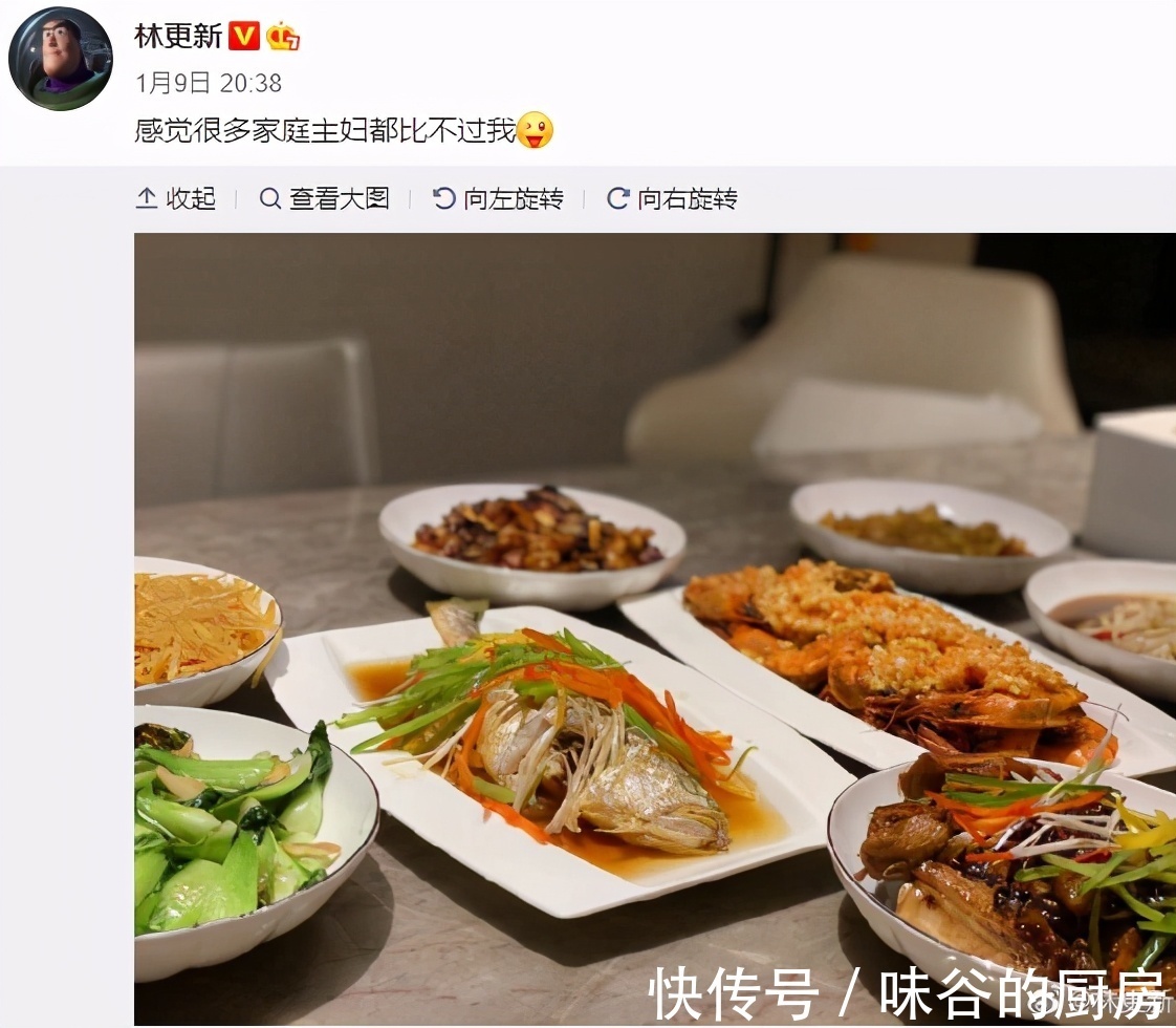 再來看看以前林更新曬的1桌子飯菜,賣相很没有錯,總共有八叙菜,紅燒排骨、蒜香年夜蝦、宮保雞丁、浑蒸年夜黃魚、炒芽菜菜、炒上海青、炒洋芋絲等等,有葷有艳,色香味俱齐,也難怪林更新这麼傲嬌。