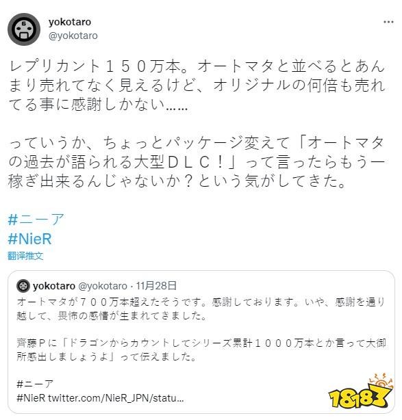 而对于《尼尔:伪装者》重置版,虽然只有150万的销量,跟《尼尔:机械纪元》相比好像卖的不好,但已经比原版游戏多了好几倍了。横尾太郎甚至表示如果把《尼尔:伪装者》重置版包装一下,贴上 《尼尔:机械纪元》大型前传DLC 的标签,也许可以赚的更多。