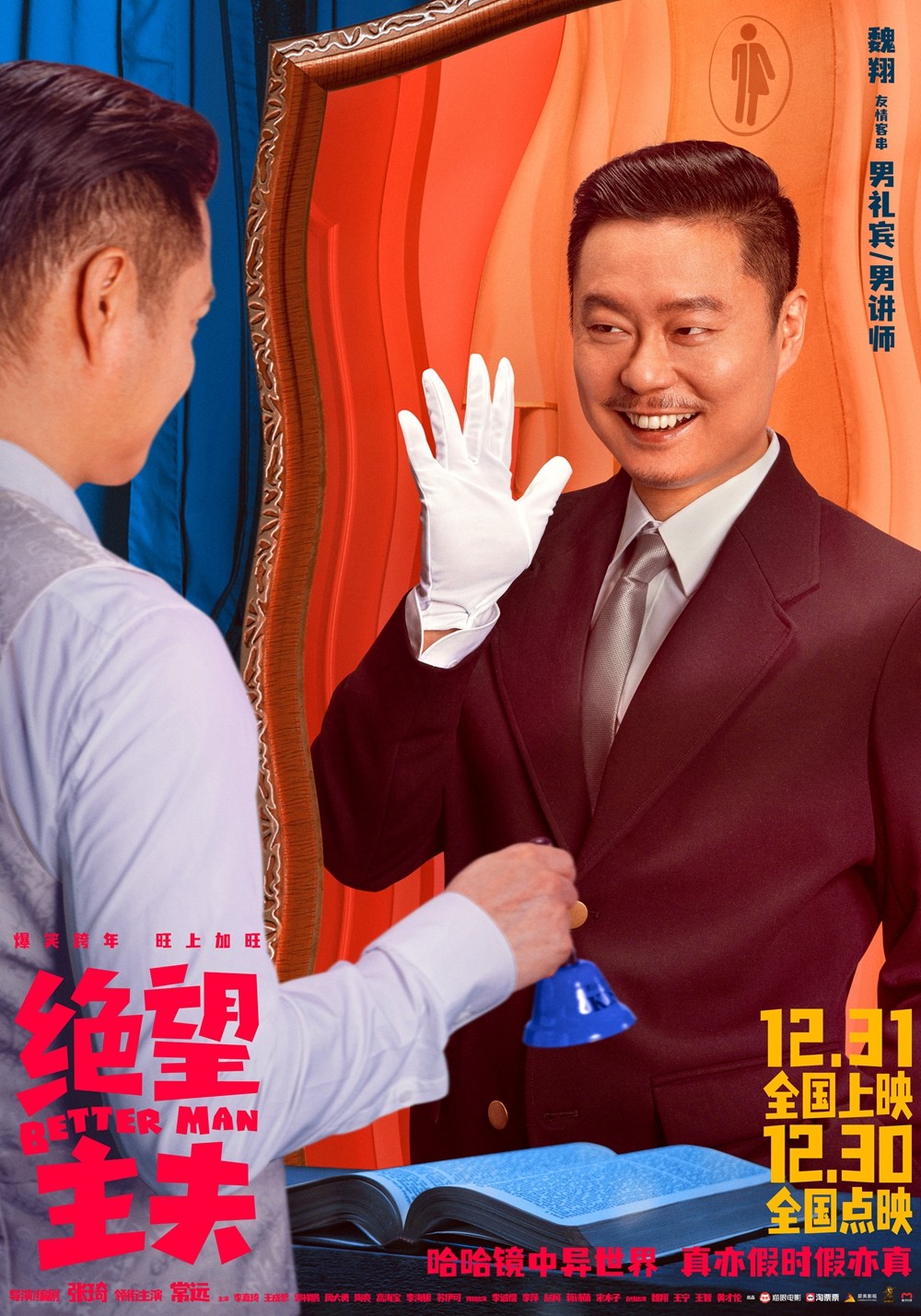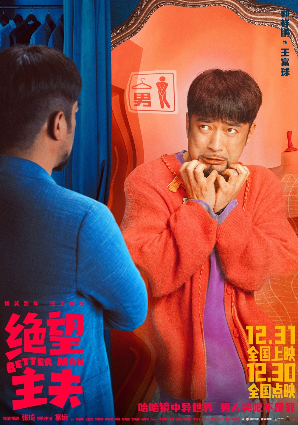 電影《絕望主夫》在世界觀設定上發揮瞭天馬行空的想象力,一邊是正常的現實世界,另一邊則是宛若哈哈鏡的全新異世界,觀眾將跟隨主人公胡鐵男的腳步去體驗現實世界與異世界之間碰撞出的諸多笑點。最新曝光的海報中,片中角色在兩個世界所呈現的反差狀態展現得十分生動有趣,電影的各個主人公在哈哈鏡的映照下形象發生顛覆性改變:胡鐵男(常遠飾)及“主夫團”成員高達(王成思飾)、王富球(郭祥鵬飾)從精英男士變身傢庭主夫,沉穩的背影與生動的表情反差感十足;妻子許薇薇(李嘉琦飾)與女警察(王智飾)在鏡中成為堅毅果斷的女強人,與她們在片中現實世界裡溫婉的形象形成鮮明對比;男禮賓(魏翔飾)則十分搞怪,誇誕的表情逗人發笑,但這個角色的隱藏身份更加神秘,他在影片中將為胡鐵男與“主夫團”量身定制下怎樣的考題?給他們的生活開一個怎樣的“玩笑”?而“主夫團”成員們又將如何迎接這場爆笑又紮心的改造?不禁令人十分期待。