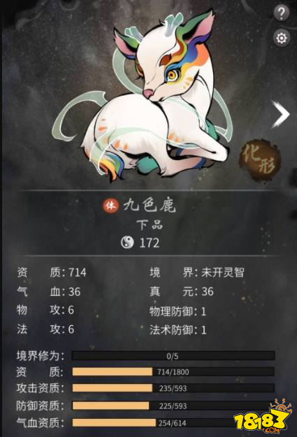 1、九色鹿资质比四只初始灵兽高,但是比玄蛇低,三个资质中气血略高,从技能来看多为物理输出加debuff,且有2个群体攻击,属于辅助灵兽,法体都可用。
