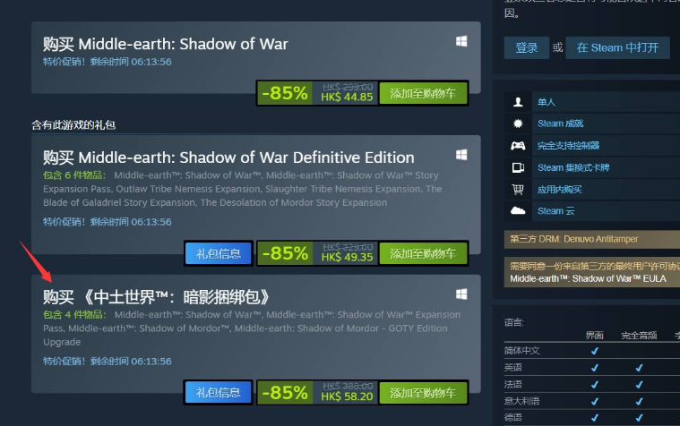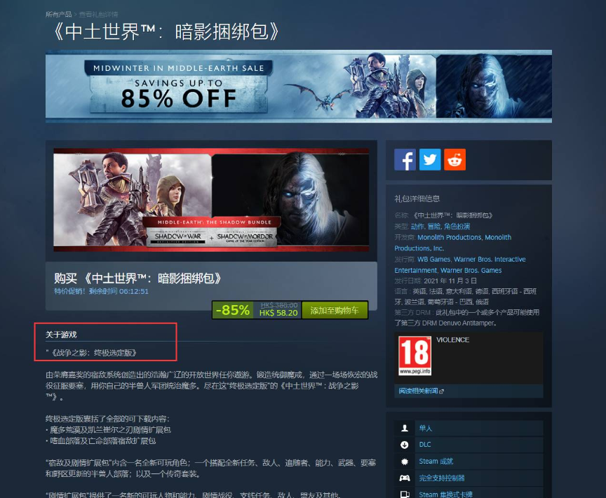 中土世界:战争之影暗影组合包里是包含中土世界:战争之影终极版,而终极选定版囊括了全部的可下载内容: