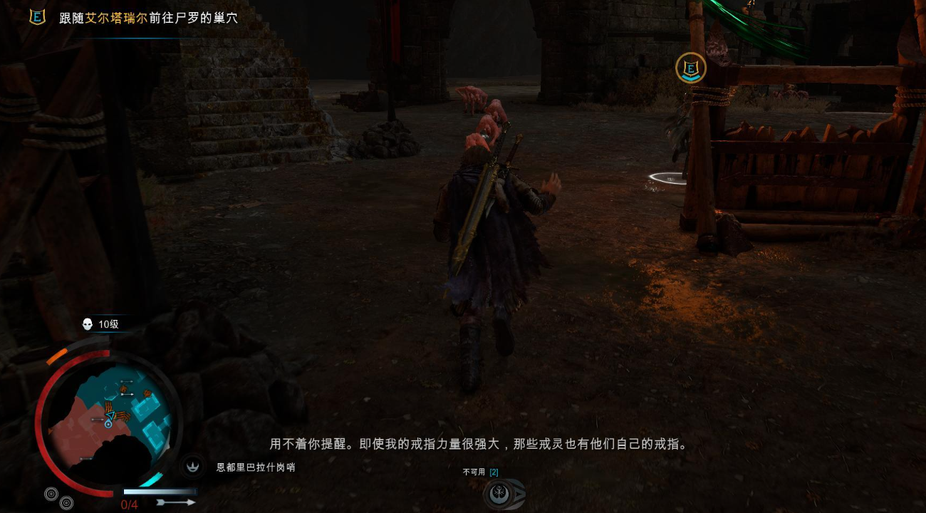 进入剧情:在艾尔塔瑞尔的帮助下,戒灵们的攻势被暂缓,让塔里昂得以见到尸罗。她似乎已受到重创,而在最后一刻,她决定将戒指交还给塔里昂。艾尔塔瑞尔对塔里昂使用这枚戒指颇有非议。