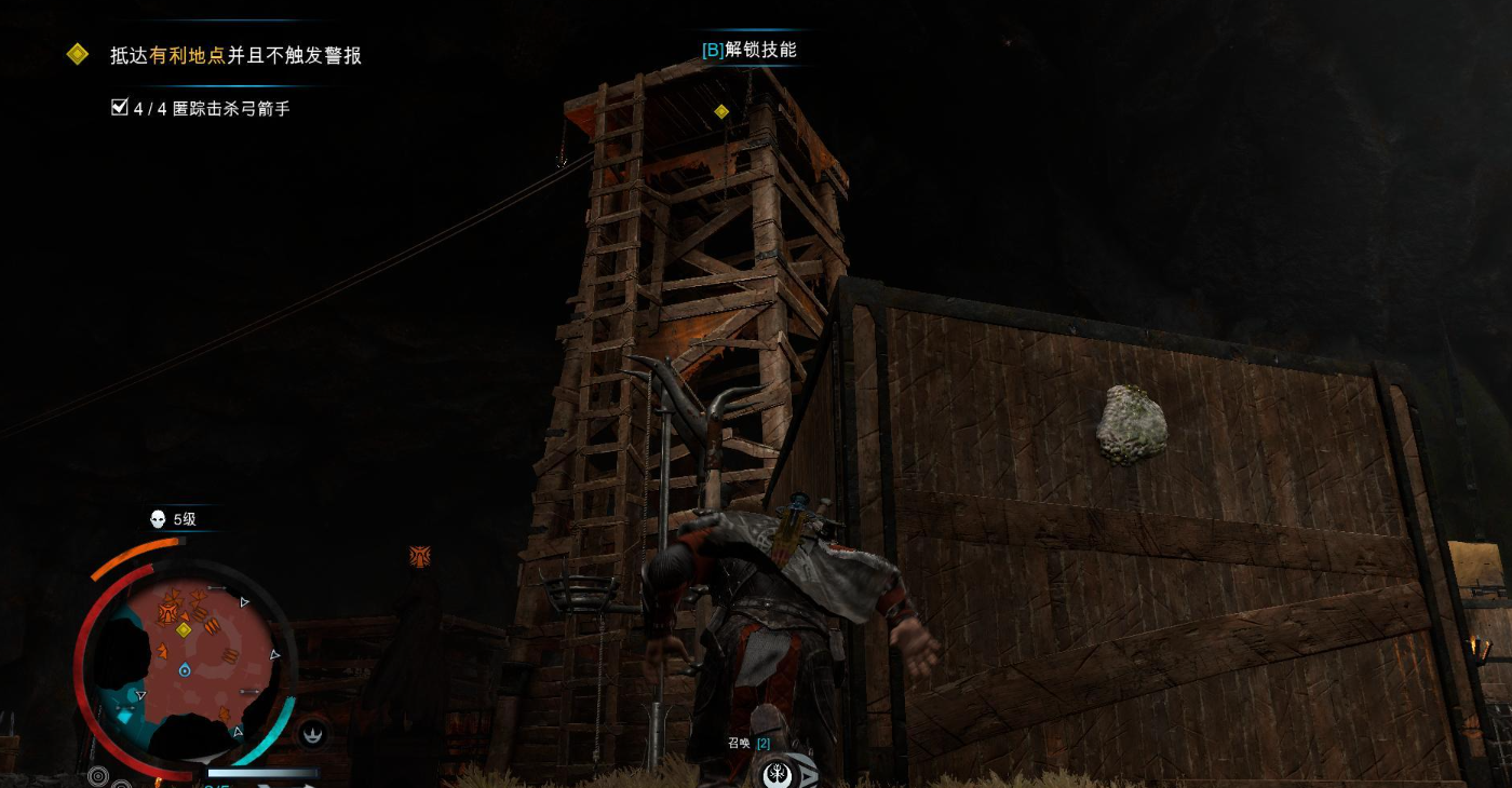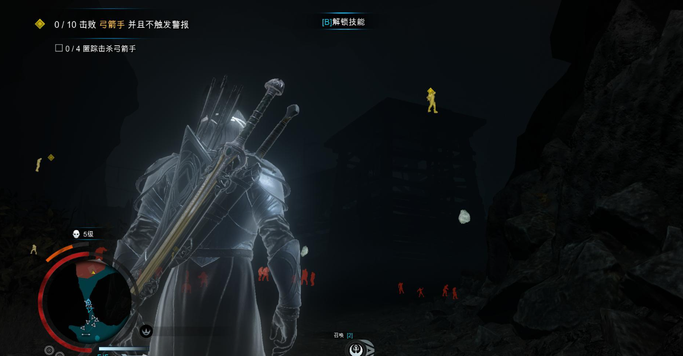 抵达巴拉诺身边后,他交给我们的任务是收拾10名弓箭手,期间不得触发警报,并且潜行击杀4名弓箭手。