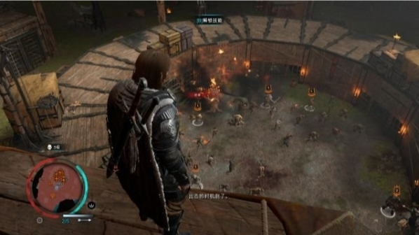 不过我们暂且不需要急着跳到竞技场内战斗,而是等莫祖无心者走到酒桶附近,射击酒桶,爆炸会导致莫祖无心者处于虚弱状态,这时再从高处对莫祖无心者发动空中暗杀。