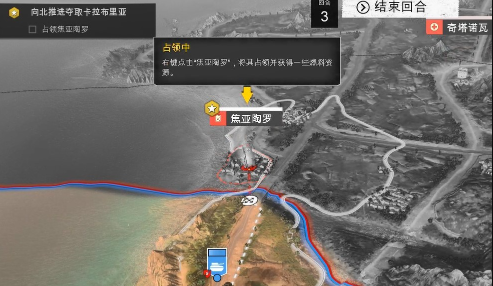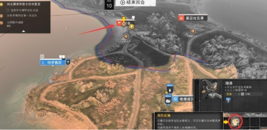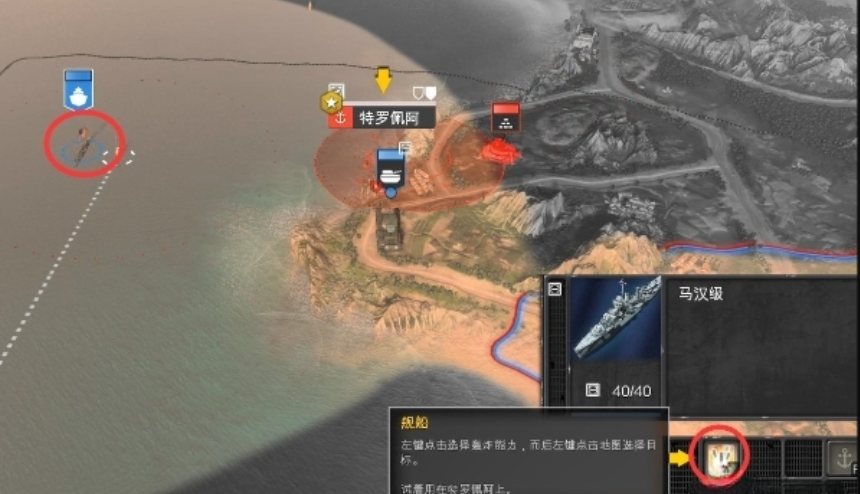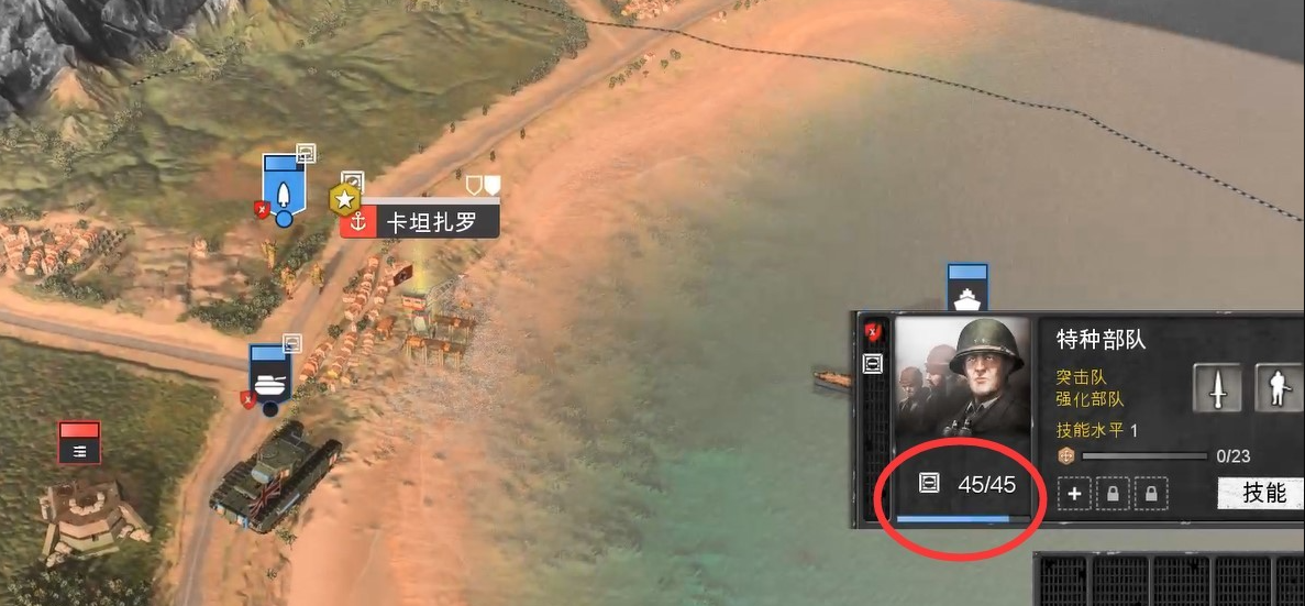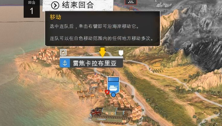 在战略地图上,选中连队后,单击右键即可沿海岸移动它。连队在一个会合内可以移动的最远距离以白色线圈的范围表示。