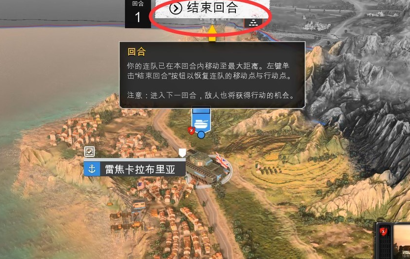 移动连队至最大距离后,左键单击 结束回合 按钮以恢复连队的移动点与行动点。