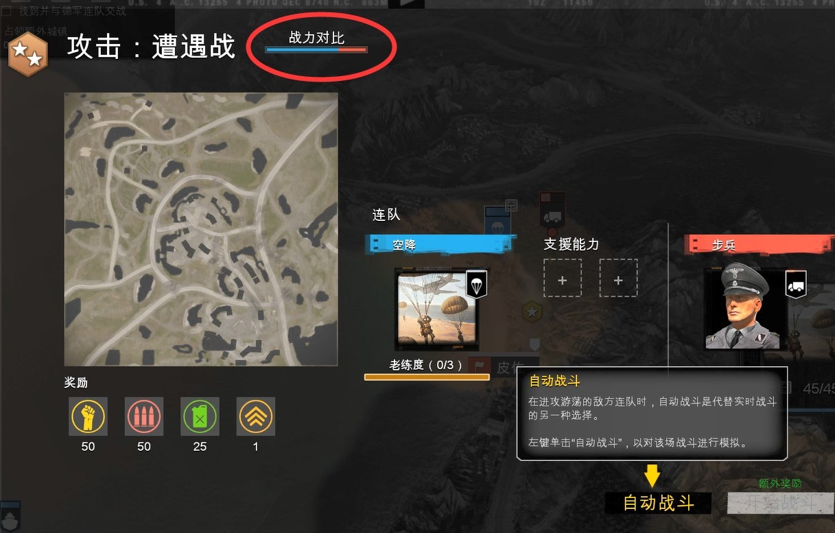 与敌人交战时,注意战力对比,我方占较大优势时选择自动战斗直接获胜。