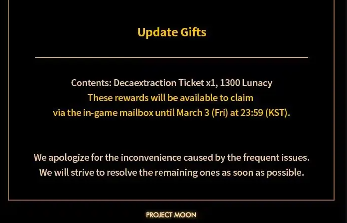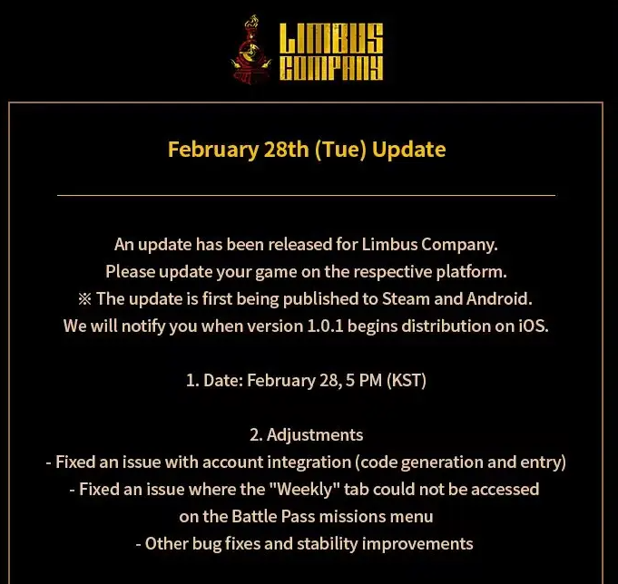 Limbus Company现已推出更新档案。为了使广大玩家流畅的运行游戏,请在商店内进行游戏更新。使用Steam及Android的设备会先行更新。关于IOS设备的更新,1.01版本发布后会再度进行说明。