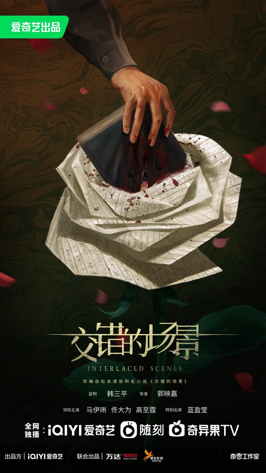 劇方同步發佈的概念海報,也似乎暗藏玄機。海報中,一隻帶血的手緊緊握住一本沾滿血跡的小說,小說上隱隱可見的血色抓痕;而用手稿堆砌而成的白玫瑰、四散飄落的紅玫瑰,是否預示瞭劇中角色的命運?這份質感十足的風格化物料一經釋出,讓觀眾對劇集充滿瞭好奇。