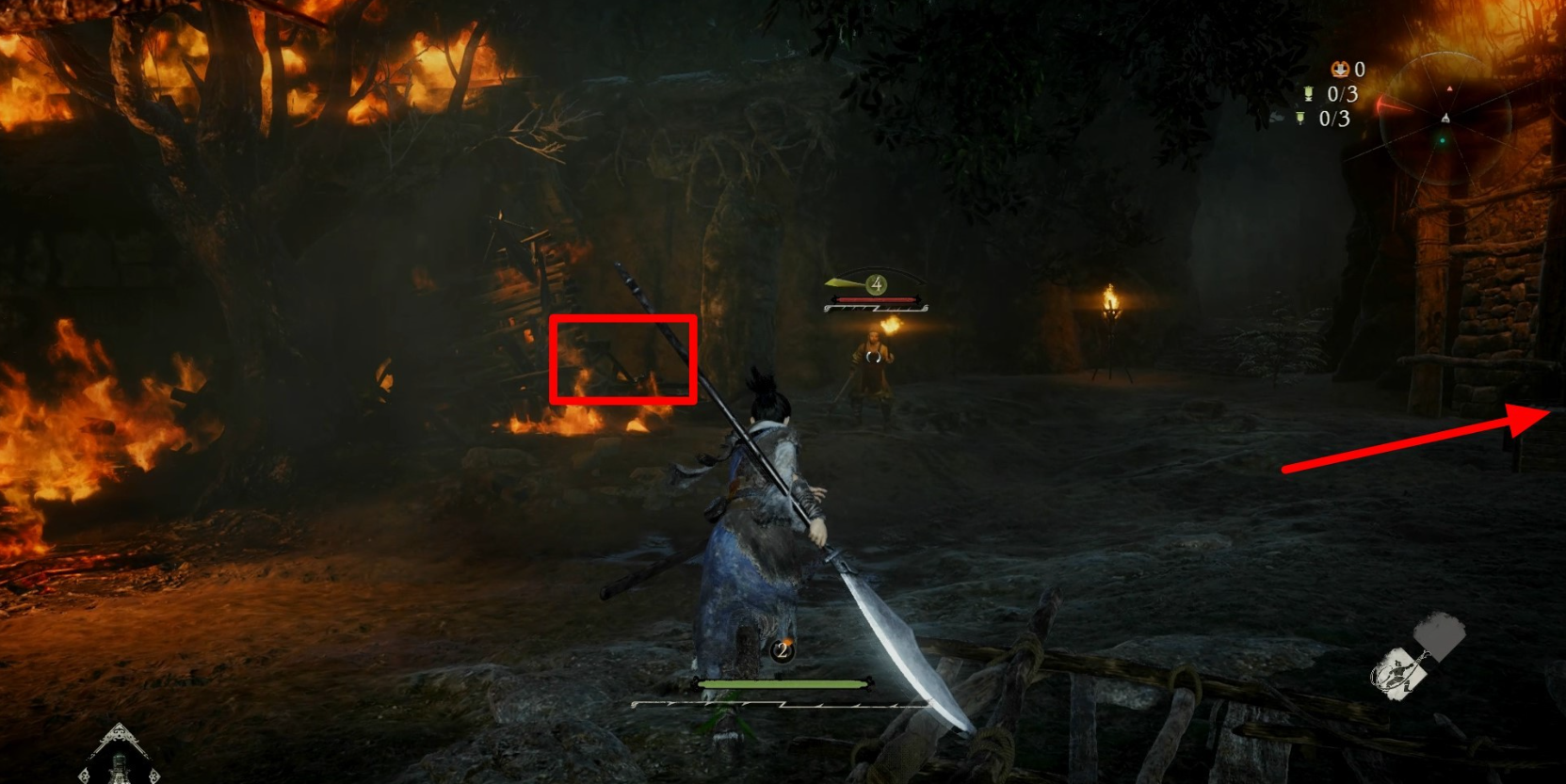 沿着台阶向上前进来到一个敌人的小据点后,消灭前方举火把的敌人。