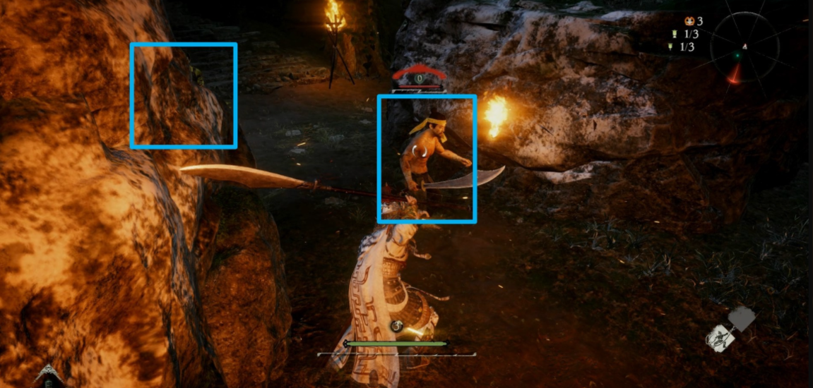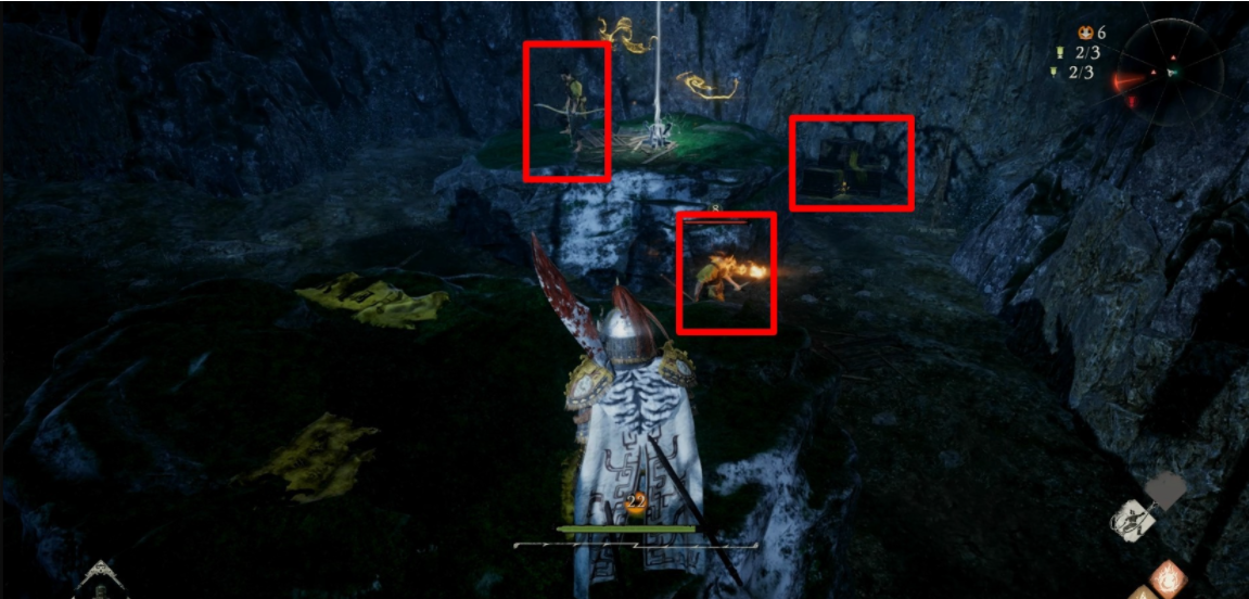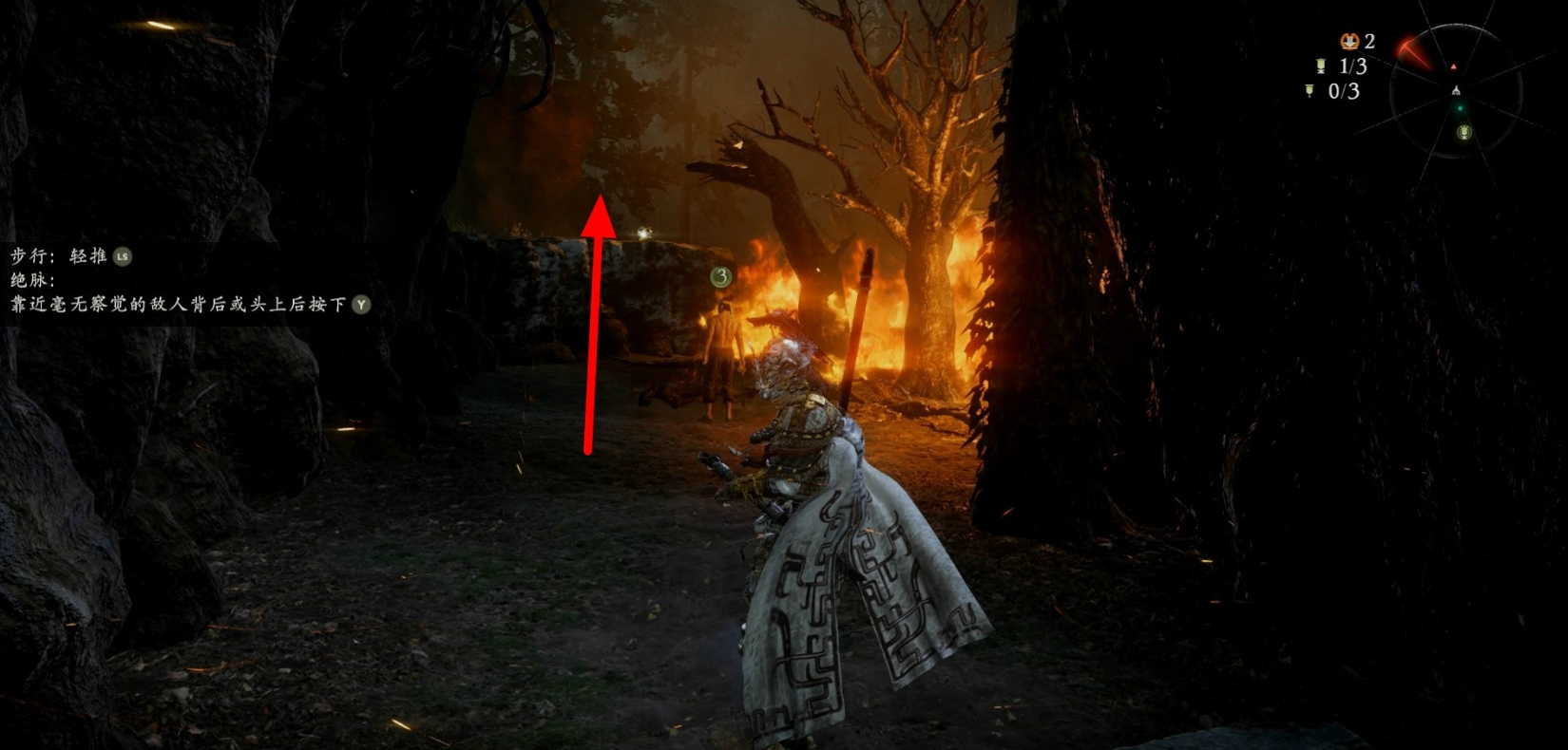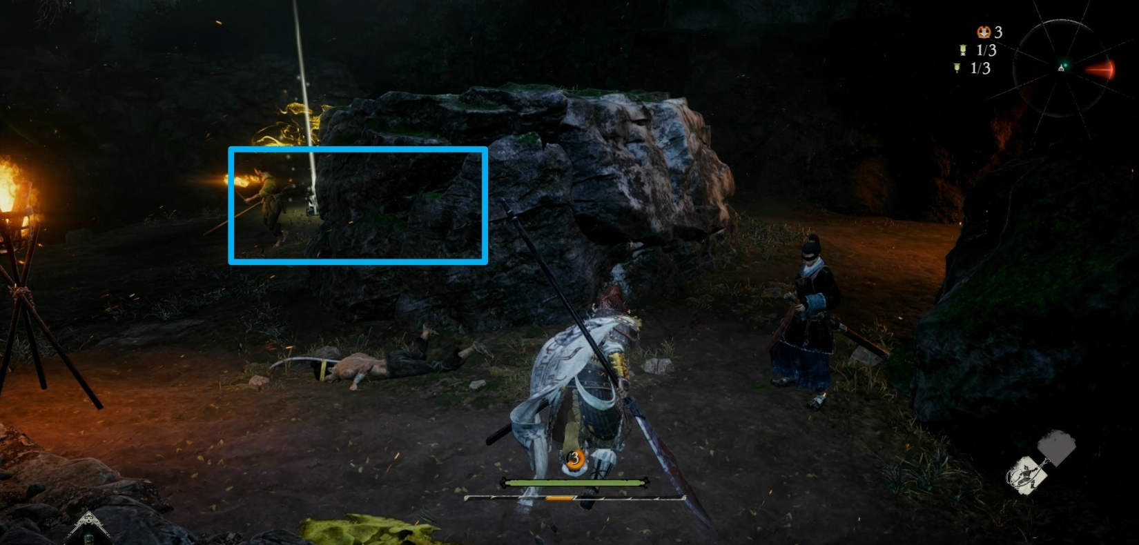在石头另一侧的旌旗底座旁边还有两名敌人,爬上石头可以暗杀处决一名,再消灭第二名即可。